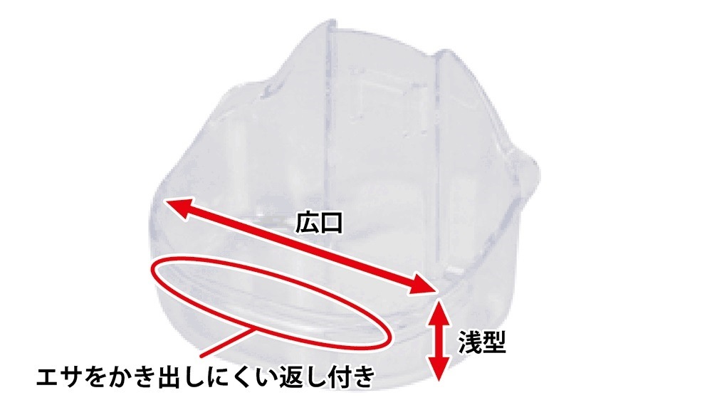 食器は浅型・広口で食べやすく、食器のフチに “カエシ”が付いているので、フードを掻き出しにくい構造になっています。
