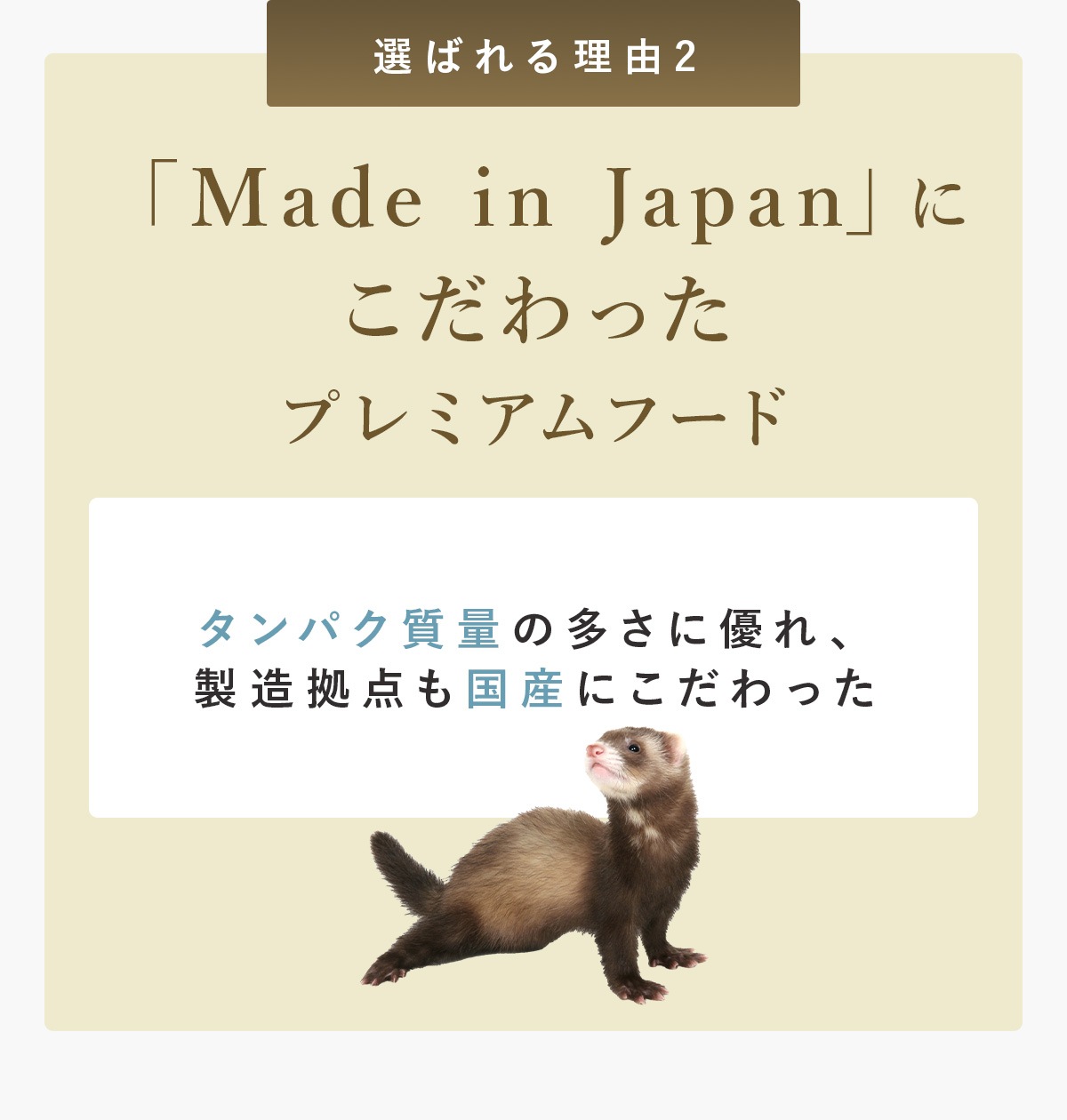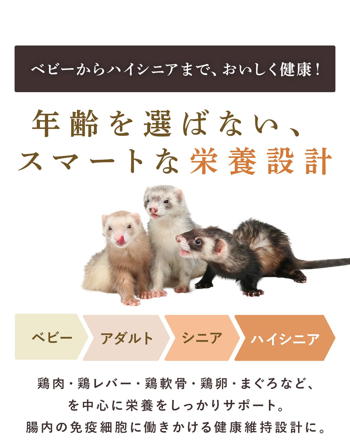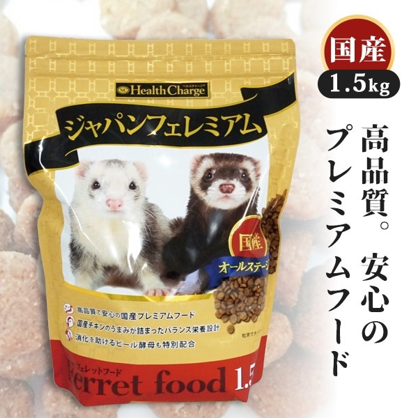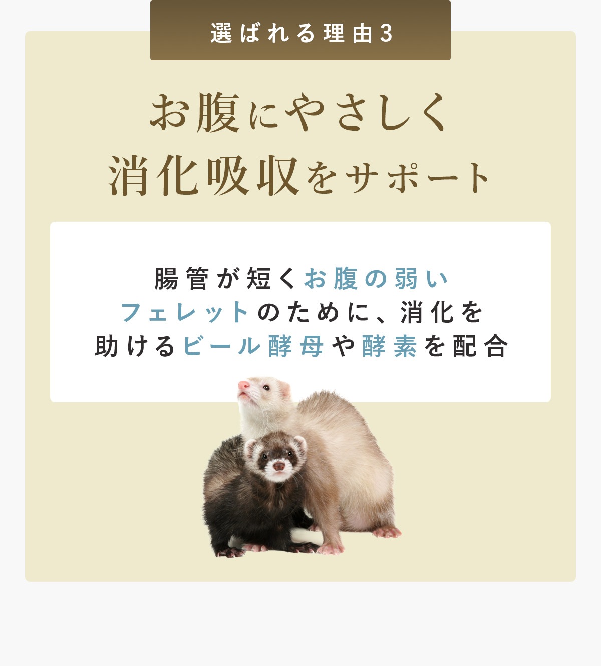 ・腸管が短くお腹の弱いフェレットに、より消化吸収を高めるため、ビール酵母、酵素など消化に良い原料を使用しています。
