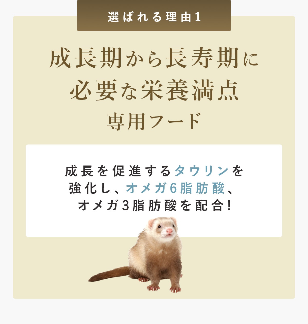 ・フェレットの健康維持に必要なβ-グルカンを多く含む黒酵母、タウリン、クランベリーを配合することにより、腸内の免疫担当細胞に働きかけます。